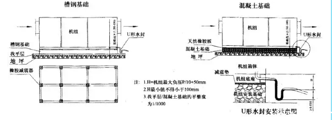(2)机组应安置在合适的基础上,安装基础建议采用以下两种形式,基础应调整好水平度并具有足够的支承强度。(见图2-机组安装基础示意图所示)